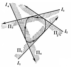 Рис. 1.1.20 Определение 1.1.21. Если точки А, В, С, ..., Р кривой К расположены в циклическом порядке, то многоугольник АВС...Р называется вписанным в кривую К. Определение 1.1.22. Если l1, l2, ... , lп это п опорных прямых выпуклой фигуры Ф, на каждой из которых установлено направление, а П1, П2, ... , Пn - соответствующие им левые полуплоскости (рис.1.1.21), то Ф расположена в каждой из этих левых полуплоскостей, а значит, и в их пересечении. Если это пересечение ограничено, т. е. является многоугольником, то этот многоугольник называется описанным вокруг фигуры Ф или вокруг ограничивающей ее кривой К. [8, 27]
