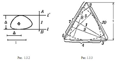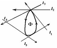 Рис. 1.1.21 Из этого определения следует, что многоугольник, описанный вокруг выпуклой фигуры, всегда является выпуклым. Сторонами описанного многоугольника являются отрезки прямых l1, l2, ... , lп. Может, однако, оказаться, что три (или больше) из взятых п опорных прямых будут проходить через одну и ту же граничную точку фигуры Ф (которая в этом случае обязательно является угловой; рис. 1.1.22). В таком случае описанный многоугольник будет иметь меньше чем п сторон. Такой многоугольник называют n-угольником, имеющим одну или несколько сторон нулевой длины, т. е сторон, превратившихся в точки. Эти стороны нулевой длины имеют определенные направления, а именно направления соответствующих опорных прямых