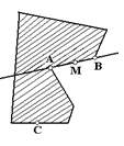 Если это пересечение — луч (прямая l1 на рис. 1.1.31), то его начало А’ будет единственной граничной точкой фигуры Ф, лежащей на прямой l1. Если, наконец, прямая l целиком принадлежит фигуре (рис. 1.1.32), то на этой прямой нет ни одной граничной точки фигуры Ф. Если фигура Ф ограничена, то ее пересечение с прямой также ограничено и, следовательно, является отрезком. Таким образом, на каждой прямой l, проведенной через внутреннюю точку ограниченной выпуклой фигуры Ф, имеются ровно две граничные точки этой фигуры. [8, 142] Задача № 1.1.5 Утверждение данной задачи равносильно утверждению, что для всякой ограниченной невыпуклой фигуры Ф найдется прямая, пересекающая ее границу более чем в двух точках. Докажем это. Пусть Ф — ограниченная невыпуклая фигура. В таком случае найдутся такие точки А и В, принадлежащие Ф, что отрезок, их соединяющий, не принадлежит целиком фигуре Ф; обозначим через С точку отрезка АВ, не принадлежащую Ф (рис. 1.1.33, а). Мы всегда можем предположить, что точка А — внутренняя точка Ф.