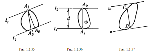 Задача №1.1.7 Пусть Ф — выпуклая фигура, l1 и l2 — параллельные опорные прямые, расстояние между которыми имеет наибольшее возможное значение d, А1 и А2 — общие точки фигуры Ф и прямых l1 и l2 соответственно. Так как отрезок А1А2 перпендикулярен к прямым l1 и l2 (см. задачу 1.1.6), то длина его равна d (рис. 1.1.36). Остается только доказать, что расстояние между любыми двумя точками фигуры Ф не превосходит d. Действительно, если В и С — какие-либо две точки фигуры Ф, а т и п — опорные прямые, перпендикулярные к прямой содержащей отрезок ВС (рис. 1.1.37), то отрезок ВС не превосходит расстояния между прямыми т и п, которое в свою очередь не превосходит d. Следовательно, длина ВС не может быть больше d.