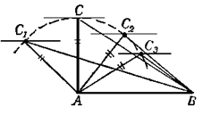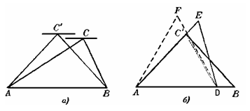 Рис. 1.2.3 б) Наложим два треугольника, удовлетворяющих условию задачи, друг на друга, чтобы их основания совпали, вершины С и С’ были расположены по одну сторону от общего основания АВ и чтобы одновременно выполнялись следующие условия: