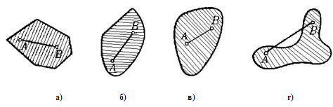 Рис. 1.1.1 Так, на рис. 1.1.1 фигуры а), б), в) выпуклые фигуры, а фигура на рисунке 1.1.1 г) не выпукла. Круг и треугольник являются выпуклыми фигурами, четырехугольник же может быть как выпуклым, так и невыпуклым в зависимости от того, пересекаются ли его диагонали внутри или вне четырехугольника (рис. 1.1.2 а, б). [1, 38]