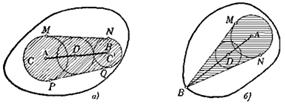 Рис. 1.1.28 Задача №1.1.3 а) Пусть А и В — две внутренние точки фигуры Ф. Согласно определению внутренних точек (определение1.1.4) существуют два круга С и С’ с центрами соответственно в точках А и В, все точки которых принадлежат фигуре Ф (рис. 1.1.29, а). Пусть МN и РQ — внешние общие касательные кругов С и С’. В силу выпуклости Ф вся криволинейная фигура МРQN, заштрихованная на рис. 1.1.29, а) принадлежит Ф, и следовательно, каждая точка D отрезка АВ является центром некоторого круга, все точки которого принадлежат Ф (этот круг вписан в фигуру МРQN). б) Доказательство почти не отличается от доказательства пункта а), только окружность С’ приходится заменить одной точкой В и фигуру МPQN — фигурой MBN, заштрихованной на рис. 1.1.29, б).