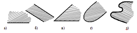 Рис. 1.1.2 Определение 1.1.2. Пересечением двух (или нескольких) фигур называется фигура, состоящая из всех точек, принадлежащих обеим (или всем, если их несколько) фигурам. Определение 1.1.3. Фигура называется ограниченной, если она целиком помещается внутри некоторой окружности. [8, 13] Например, всякий параллелограмм, треугольник, круг, а также все фигуры, изображенные на рис. 1.1.1, являются ограниченными фигурами. На рис. 1.1.3 изображено несколько неограниченных фигур; из них выпуклыми являются фигуры а) (полуплоскость), б) (полоса), в) (угол) и г).