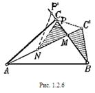 С другой стороны, точка Р будет находиться между М и С, так как если бы она совпала с некоторой точкой Р’ на продолжении МС, то из равенства периметров двух треугольников мы имели бы АС+СВ=АС’+С’В, т.е. АС+Р’М-СР’+МВ = АN+NМ+MC’+С’В. Отсюда, так как: Р’М=МС’, МВ=МN и С’В=Р’N, мы имели бы: АС=АN +NР’+Р’С, что невозможно. Отняв теперь от треугольников АВС и АВС’ равные между собой треугольники NМР и МВС’ (заштрихованные на рис. 1.2.6), мы сразу обнаружим, что треугольник АВС имеет большую площадь. Нам еще остается доказать, что: СА — СВ< С’А — С’В. Для этого достаточно проверить, что АС<АС’ (а следовательно, ВС>ВС’). Действительно, если бы было АС>АС’, ВС<ВС’, то из рассмотрения треугольников АСС’ и ВСС’ мы получили бы два несовместных неравенства: