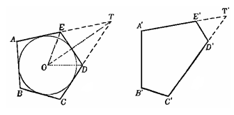 Рис. 1.1.22 Это позволяет говорить об п внутренних и внешних углах описанного n-угольника независимо от того, имеет ли он стороны нулевой длины или нет. Определение 1.1.23. Длиной ограниченной выпуклой кривой К и площадью фигуры Ф, которую эта кривая ограничивает, называются пределы периметров, соответственно площадей, вписанных в Ф многоугольников, все стороны которых безгранично уменьшаются, или описанных вокруг Ф многоугольников, все внешние углы которых безгранично уменьшаются. Из этого определения следует, что если выпуклая кривая К целиком заключена внутри выпуклой кривой К’, то длина К не может быть больше длины К’. Теорема 1.1.3. Если выпуклая кривая К целиком заключена внутри выпуклой кривой К’, то длина К не может быть больше длины К’. Доказательство. Действительно, рассмотрим последовательность многоугольников, вписанных в кривую К, стороны которых безгранично уменьшаются, и последовательность многоугольников, описанных вокруг К’, внешние углы которых безгранично уменьшаются (рис. 1.1.23).
