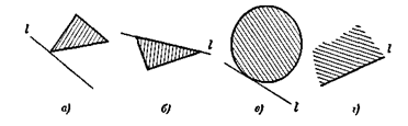 Рис. 1.1.5 Например, прямая, проведенная через вершину треугольника параллельно противолежащей стороне (рис. 1.1.6, а), или сторона треугольника (рис. 1.1.6, 6) являются опорными прямыми треугольника; каждая сторона выпуклого многоугольника является его опорной прямой. Касательная к окружности является опорной прямой для круга, ограниченного этой окружностью (рис. 1.1.6, в). Опорная прямая может иметь с выпуклой ограниченной фигурой или единственную общую точку (см., например, рис. 1.1.6, а, в), или целый общий отрезок (рис. 1.1.6, б); если выпуклая фигура не ограничена, то опорная прямая может даже целиком принадлежать фигуре (рис. 1.1.6, г). [8, 18]