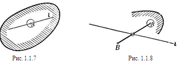 Рис. 1.1.6 Опорную прямую выпуклой фигуры Ф можно также определить следующим образом: Определение 1.1.13. Опорная прямая выпуклой фигуры Ф - это такая прямая, которая содержит граничные точки фигуры, но не содержит ни одной ее внутренней точки. Действительно, прежде всего ясно, что опорная прямая не может содержать внутренней точки А фигуры: в противном случае точки фигуры Ф, расположенные внутри некоторой окружности с центром в точке А, находились бы по обе стороны от опорной прямой (рис. 1.1.7). С другой стороны, если прямая l не содержит внутренних точек выпуклой фигуры Ф, то вся фигура должна быть расположена по одну сторону от l. Действительно, пусть А — какая-нибудь внутренняя точка Ф. Если бы какая-либо (внутренняя или граничная) точка В фигуры находилась по другую сторону от прямой l, чем точка А (рис. 1.1.8), то точка пересечения прямой l с отрезком АВ была бы внутренней точкой Ф (см. задачу 1.1.3 а, б). [8, 19]