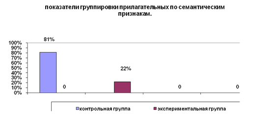 Вывод: Сравнив результаты, полученные при исследовании активного и пассивного словаря детей, можно сделать следующие выводы: объем пассивного словаря у детей контрольной группы незначительно больше объема активного, а у детей экспериментальной группы объем пассивного словаря шире объема активного словаря. · Третье задание было направлено на исследование процессов группировки прилагательных по семантическим признакам. Полученные результаты показали, что в отличие от детей контрольной группы дети экспериментальной группы затрудняются в дифференциации прилагательных по семантическим близким признакам. Они при выполнении задания допускали ошибки т. к. не могли выделить основной семантический признак значения слова. Правильно ответить не смог не один ребенок из экспериментальной группы дети выполняли задание по аналогии, не противопоставляя заданные понятия. Данные представлены в диаграмме 3. Диаграмма 3 Исследование процессов группировки прилагательных по семантическим признакам