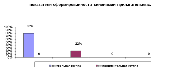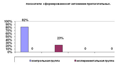 сформированности синонимии прилагательных Как видно из диаграммы, дети контрольной группы, более точно подбирают синонимы к словам- стимулам. Хотя они и испытывают трудности в подборе синонимов, но лишь к отдельным словам, то у дошкольников с ОНР выявляются ошибки при подборе синонимов к преобладающему большинству слов. При этом у детей с ОНР наблюдается разнообразный характер ошибок: -Слова, связанные синтагматическими связями со словами-стимулами ( веселый- довольный); - Слова, ситуативно близкие, исходному типу, но заменяя их другими частями речи при подборе синонимов прилагательные чаще заменялось наречием, реже глаголом. (горький- невкусно); - Слова связанные парадигматическими связями (мудрый- много думает ); - Слова образованные сокращением слова. ( прекрасный- красный) Особые трудности у детей экспериментальной группы вызвали слова (косой, скорый, тощий, упорный) дети отказывались от ответа. Выводы: На основании данных исследований, приведенных выше, можно сделать следующие выводы: у старших дошкольников с общим недоразвитием речи наблюдается несформированность атрибутивного словаря, проявляющая в качественных и количественных особенностях отдельных параметров. (объема активного и пассивного словаря, уровня сформированности синонимии и антонимии, группировки прилагательных). · Исследование объема активного и пассивного атрибутивного словаря у дошкольников с ОНР и их сверстников с речевым развитием в норме выявило следующие особенности: - Объем активного словаря у дошкольников с ОНР значительно меньше, чем у их сверстников с речевым развитием в норме. - Дошкольники с ОНР понимают значения многих слов; - Объем их пассивного словаря близок к норме. - Одной из выявленных в исследовании особенностей речи детей с ОНР является более значительное, чем в норме, расхождение в объеме пассивного и активного словаря. - Актуализация словаря вызывает большие затруднения у дошкольников с ОНР . Неточное употребление слов, одно и тоже слово может заменять целую группу характеристик предмета. Так например слово маленький может обозначать такие качественные характеристики как величина, высота, ширина. Дети не знают названия оттенков цветов, форму и размеров . В одних случаях дети употребляют слова в излишне широком значении, в других – появляется слишком узкое понимание значения слова и активного словаря. · Исследование процессов группировки прилагательных по семантическим признакам. Проанализировав полученные данные можно сделать следующий вывод. Организация семантических полей у детей с ОНР имеет специфические особенности, основными из которых являются следующие: – ассоциации у детей с ОНР в большей степени, чем у детей с нормальным речевым развитием, носят немотивированный, случайный характер; – наиболее трудным звеном формирования семантических полей у детей с нарушениями речи является выделение центра семантического поля и его структурная организация; – у детей с ОНР наблюдается малый объем семантического поля, что проявляется в ограниченном количестве смысловых связей. Замены прилагательных свидетельствуют о том, что дети не выделяют существенных признаков, не дифференцируют качества предметов. · Исследование особенностей состояния синонимии и атонимии у дошкольников с ОНР. Выполнение заданий на подбор ан