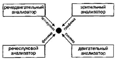Садовникова И.Н. определяет круг вопросов, который позволяет проследить воздействие ряда онтогенетических факторов на формирование письменной речи, а именно: становление механизмов устной речи и эволюция пространственного различения у нормально развивающегося ребенка.[47] Первый ряд вопросов связан с тем, что письменная речь использует готовые механизмы устной речи. Выделение второго ряда связано с пониманием того, что в определенном смысле процесс чтения включает перевод пространственной последовательности графических знаков во временную последовательность звуковых комплексов, а процесс письма требует преобразования временной последовательности звуков в пространственную последовательность графических знаков. Сенсомоторной основой психического развития ребенка являются координации между глазом и рукой, между слухом и голосом (А. Валон).[8] Формирование речевой функции в онтогенезе происходит по закономерностям, определяющим последовательное и взаимосвязанное развитие всех сторон речевой системы (фонетической стороны, лексического запаса и грамматического строя). Функция слухового анализатора формируется у ребенка значительно раньше, чем речедвигательного: прежде чем звуки появятся в речи ребенка, они должны быть дифференцированы им на слух. В первые месяцы жизни ребенка звук сопровождает непроизвольную артикуляцию, возникая вслед за движениями органов артикуляционного аппарата. В дальнейшем соотношение между звуком и артикуляцией в корне меняется: артикуляция становится произвольной, соответствуя звуковому выражению (Н.Х. Швачкин). Образцом произношения для ребенка является речь окружающих. Но на определенном этапе речевого развития ребенку недоступна артикуляция какого-то звука, и он вынужден временно заменить его одним из артикуляторно близких и доступных звуков. Такой заменитель нередко бывает акустически далек от слышимого образца. Это акустическое несоответствие становится стимулом к поиску более совершенного артикуляционного уклада, который соответствовал бы слышимому звуку. В этом процессе ведущая роль принадлежит слуховому восприятию, но при этом ход приближения к искомому звуку подчинен возможностям развития речедвигательного анализатора (В.И. Бельтюков).[5] Когда фонетическая сторона речи сформирована, слуховой анализатор получает функциональную самостоятельность. Звуки речи как бы уравниваются по степени сложности их различения и воспроизведения. Звуки речи не существуют обособленно, а лишь в составе слов, словосочетаний, фразах, в потоке речи. Взаимодействие фонетической и лексико-грамматической сторон речи раскрывается в теории механизмов речи Н.И. Жинкина, в соответствии с которой механизм речи включает два основных звена: 1) Образование слов из звуков; 2) Составление сообщений из слов.[16] Слово есть место связи двух звеньев механизма речи. На корковом уровне произвольного управления речью образуется фонд тех элементов, из которых формируются слова - «решетка фонем». Во второй ступени отбора элементов образуется так называемая «решетка морфем». Согласно теории Н.И. Жинкина, слова становятся полными только в операции составления сообщений. Весь смысл работы речедвигательного анализатора заключается в том, что он может продуцировать каждый раз новые комбинации полных сл
