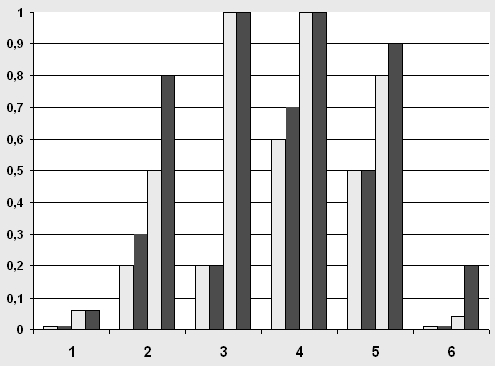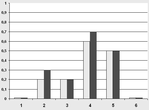 По вертикальной оси обозначена острота зрения. По горизонтальной оси отмечены дети пятого года жизни со зрительными нарушениями формирующей группы в соответствии с порядковым номером табл. № 1. Желтый – острота зрения правого глаза. Красный – острота зрения левого глаза. В графике №3 отражены результаты констатирующего и контрольного эксперимента формирующей (экспериментальной) группы. График №3.