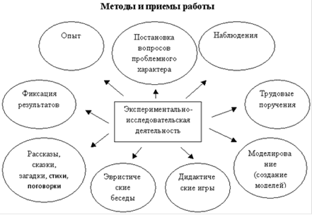 Кроме указанных, проводились эксперименты и с другими предметами неживой природы: 1. Измерить температуру воздуха в квартире, на улице и сравнить. 2. Налить воду в формочки для льда и заморозить её в холодильнике или на улице в морозный день. Предложить взять в руки кубики льда и наблюдать, как лёд растает, и превратиться в воду. Сравнить, у кого быстрее растает лёд: кто держал его в рукавичках или голых руках. На огне довести воду до кипения, наблюдать за паром, подставить стёклышко и увидеть, как пар опять превращается в воду. 3. В ванночку с водой опускать различные по весу предметы. В одном стакане растворить 5 чайных ложек соли, а другой оставить с пресной водой, опустить в оба стакана яйца. Бросить в стакан с водой сначала щепотку сахарного песку, затем соли, кристалликов марганца. 4. Помахать веером около лица, чтобы почувствовать движение воздуха. Опустить пустую бутылочку в таз с водой - из бутылочки выходят пузырьки. Поставить пластмассовую бутылку в холодильник. Когда она охладиться, надеть на её горлышко воздушный шарик, Поставить бутылку в миску с горячей водой. 5. Пропустить воду через песок и глину. Рассмотреть, взвесить, определить рукой температуру предметов из различных металлов. 6. Измерить температуру горячей и холодной воды. Зажечь спичку, свечу, рассмотреть пламя. Что осталось в результате горения. 7. "Радужная плёнка". Поставить миску с водой на стол, чтобы на неё не падали прямые лучи света. Подержать над миской кисточку из пузырька с лаком, пока капля лака не упадёт в воду. Наблюдать за поверхностью воды. 12. Определить стороны горизонта по компасу. Определить по компасу, где находиться север, юг, восток, запад. Мы обогащали опыт детей, шло практическое освоение детьми свойств и качеств различных материалов, дети активно участвовали в исследовании и преобразовании различных проблемных ситуаций, знакомились со способами фиксации полученных результатов. Во время совместного экспериментирования мы с детьми ставили цель, совместно с ними определяли этапы работы, делали выводы. В ходе деятельности учили детей выделять последовательность действий, отражать их в речи при ответе на вопросы типа: Что мы делали? Что мы получили? Почему? Фиксировали предположения детей, помогали им схематически отразить ход и результаты опыта. Предположения и результаты эксперимента сравнивались, делались выводы по наводящим вопросам: О чем вы думали? Что получилось? Почему? Мы учили ребят находить сходства и различия между объектами. По окончании серии экспериментов мы обсуждали с детьми, кто из них узнал что-то новое, зарисовывали схему общего эксперимента. В процессе экспериментирования дети убеждались в необходимости принимать и ставить цель, анализировать объект или явление, выделять существенные признаки и стороны, сопоставлять различные факты, выдвигать предположения и приходить к выводу, фиксировать этапы действий и результаты графически. Дети активно участвовали в предложенных экспериментах, охотно самостоятельно действовали с предметами, выявляя их особенности. Они проявили желание экспериментировать дома: исследовать различные предметы быта, их действие, что выяснялось в беседах с родителями и детьми. Некоторые дети совместно с родителями ход и результаты экспериментов, проводимых дома, зарисовывали в своих тетрадях. З