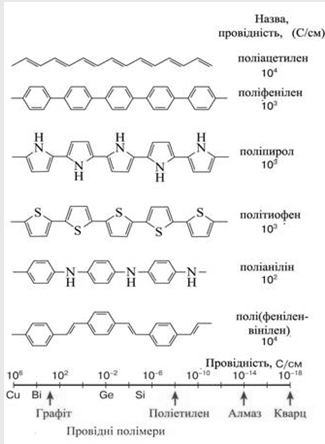 Рисунок - 1.1.1 Значення провідності основних типів спряжених полімерів. Однак, широке практичне використання таких матеріалів стримується через їхні недосконалі механічні властивості, через низьку їх еластичність, погану здатність до термопластичної обробки. Особливого значення набувають полімерні композити на основі спряжених поліаміноаренів, здатних змінювати забарвлення і відповідно спектральні характеристики під дією електричного поля або температури. Позитивних результатів слід очікувати при використанні композитів електропровідних полімерів з високопластичними матеріалами, зокрема з відомими полімерами–поліакрилатами, полікарбонатами, полівінілхлоридом та ін. ЕП дають змогу забезпечити перехід метал – ізолятор і здійснити процес створення нового покоління матеріалів з електричними і оптичними властивостями металів чи напівпровідників. Найбільш важливими областями застосування таких електропровідних сумішей або композитів є антистатичні матеріали [16, 17]. Деякі матеріали, у яких використано політіофен або поліанілін вже використовуються у виробництві екранів [18]. Іншим важливим застосуванням електропровідних полімер-полімерних композитів є їхня здатність до поглинання електромагнітного поля, що може бути використано для антирадарного захисту. Перспективним є застосування таких композитів в електротехнічній, електронній, радіотехнічній та інших галузях виробництва для отримання струмопровідних адгезивів, герметиків, заливних композицій та антистатичних покрить на металічних і неметалічних поверхнях. Більшість полімерів є електроізоляторами з дуже низьким питомим об’ємним опором. Але з них можна виготовити електропровідні композиції шляхом введення дисперсних наповнювачів (технічний вуглець, графіт, вуглецеві волокна або метали). Провідність полімерних матеріалів, що містять електропровідні наповнювачі, може змінюватись в межах десяти десяткових порядків, досягаючи значень від ізоляторів до металів (рис. 1.1.1), ЕПП є одним з найбільш цікавих класів низькорозмірних матеріалів. Основні типи спряжених полімерів наведено на рис. 1.1.1. ЕПП матеріали використовують як електроактивні плівки, інгібітори корозії, антистатичні покриття, захисні екрани від електромагнітного випромінювання, а також для створення джерел струму та оптичних вікон із регульованою областю прозорості. В останній третині XX століття синтезовані провідні й напівпровідникові полімери зі спряженими зв’язками, які можуть знайти застосування в створенні високовпорядкованих органічних матеріалів та нанодисперсій [19]. ПАн і його похідні (поліаміноарени) вважають одними з найбільш перспективних спряжених полімерів внаслідок високої стабільності, відносно низької собівартості та різноманітності електронних та оптичних властивостей, здатності поглинати радіоактивні промені. Тому саме ці ЕПП становлять найбільший інтерес для отримання функціональних полімер-полімерних композитів. Досліджень в галузі створення полімер-полімерних струмопровідних композитів досить небагато, і вони, як правило, мають пошуковий, несистематичний характер. 1.2 Методи одержання електропровідних полімерів Органічні полімери з системою спряжених зв’язків можуть бути синтезовані класичними методами хімічної вільнорадикальної полімериз