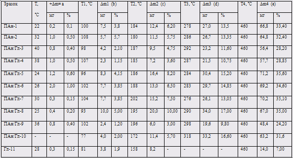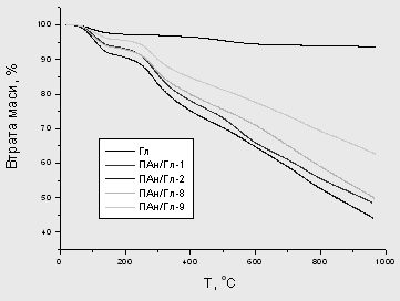Рисунок 4.2.4 – Термогравіметричні криві зразків Гл, ПАн та зразків ПАн/Гл в атмосфері азоту Залежно від середовища деструкція ПАн та ПАн/гл композитів протікає із різною втратою маси, що зумовлено внеском окиснювальних процесів в загальний процес термічної деструкції ПАн, що можна спостерігати з даних таб. 4.2.2. Таблиця – 4.2.2 Деструкрійні втрати маси композитів в різних атмосферах