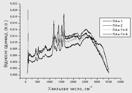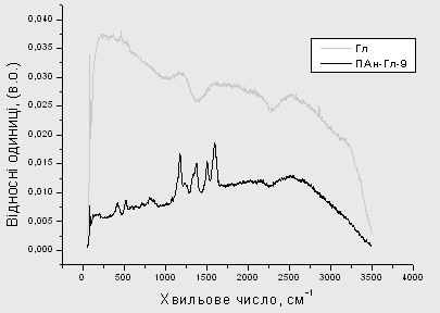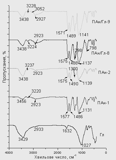 Рисунок 4.4.1.1 – ІЧ-ФП спектри зразків: Гл; ПАн-1; ПАн-2; Гл/ПАн-8; Гл/ПАн-9. Піки поглинання в межах 3400–2800 cм−1, зазвичай під назвою "H-піки", приписують водневим зв’язкам, що утворюють аміно (–NH–), і приєднавші протон іміно (NH+) групи між регулярно розміщеними ПАн ланцюгами [ 28, 39, 53, 54, 55]. З рис. 4.4.1.1 видно, що пік для зразка ПАн-1 при 3456 cм−1 зміщений відносно такого ж піку при 3438 cм−1 характерного для ПАн/Гл-8 та ПАн/Гл-9, що означає, що регулярні водневі зв’язки між регулярно розміщеними ПАн ланцюгами в зразку ПАн-2 ослаблені. Посилення водневого зв’язку в зразках ПАн/Гл-8 та ПАн/Гл-9 є можливим завдяки міжланцюговій та міжфазовій координації зумовленій впливом частинок Гл на суміжні ПАн ланцюги [9, 56]. Характер пари піків при ~1571 і ~1490 см-1 засвідчує, що синтезовані поліанілінові зразки є емеральдиновою сіллю ПАн, тобто є допованими. 4.5 Раман- ФП спектри зразків ПАн та Гл/ПАн композиту Спектр ФП-Рамана - потужний засіб дослідження взаємодії між поверхнею субстрату і абсорбованими речовинами. ФП-Раман спектри Гл, ПАн допованого H2SO4, ПАн/Гл композитів зображені на рис.4.5.1 та в додатку Е. Як видно з рис. 4.5.1, ФП-Раман спектри зразків Гл і ПАн/Гл-9 є різними. У спектрах ФП-Рамана зразків ПАн-1 та ПАн-2 наявні два широкі піки при 2687 та 2535 см-1, відповідно. Піки при 1580 (ПАн-І), 1568 (ПАн-2) і 1171 (ПАн-І) і 1170 см-1(ПАн-ІІ) відповідають бензоїдним одиницям, а піки при 1376 см-1 і 1368 характерні для хіноїдних кілець. Смуга при ~1507 см-1, що характерна для досліджуваних зразків появляється в ПАн-І, ПАн-ІІ і знаходиться при 1510 та 1507 см-1, відповідно.