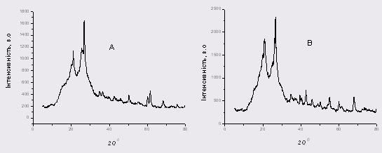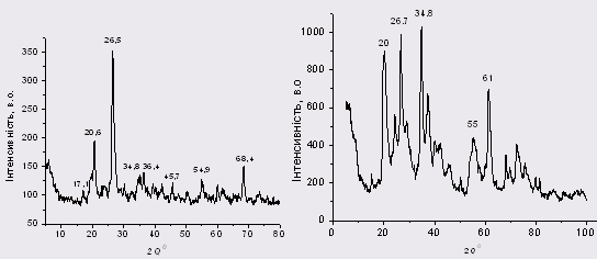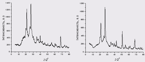 Рисунок 4.1.1 - Дифрактограма зразків глауконіту: а – природна суміш; б– сепарований. Як видно із рис. 4.1.2 і додатка Б, зразки ПАн характеризуються аморфно-кристалічною структурою – наявне гало із характерними піками середньої інтенсивності при 2q = 21,7о та 24,8о. Два широких піки, зосереджених при 2q = 21,7° і 24,8° показують, що результуючі ПАн структури є аморфними. Піку, зосередженому при 2q = 21,7° приписують періодичність паралелей в полімерному ланцюгу, тоді як останньому піку періодичність перпендикулярів в полімерному ланцюгу у кристалічній структурі макромолекули. [29]. Аморфні гало дифрактограм досліджуваних зразків практично однакові за шириною і знаходяться в межах 2q = 10о - 35о і практично накладаються одна на другу в частині, що відповідає аморфному стану (див. рис. 4.1.1 та додаток Б).