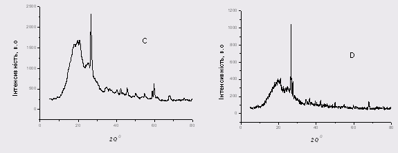 Як видно із рис.4.7.1 зміна умов синтезу композиту при однаковому співвідношенні Ан та Гл призводить до зміни структури одержаних зразків. Характер дифрактограм, зображених на рис.4.7.1 та додатку Є засвідчує, що кристалічність шарів ПАн на поверхні Гл залежить від умов синтезу, а саме температури, першочерговості додавання Ан чи NаПОДС до суміші Гл-розчин сульфатної кислоти і подальшого витримування цієї системи протягом 1 год. Очевидно, що при витримуванні Гл в розчині NаПОДС чи Ан відбувається їхня адсорбція на частинках глауконіту. Це і визначає процес нуклеації макромолеклярних ланцюгів на поверхні мінералу. На рис. 4.7.2 зображено дифрактограми зразків ПАн/Гл із різним вмістом дисперсної фази (Гл). Як видно із дифрактограм між ними наявна різниця, яка, очевидно, зумовлена вмістом мінералу. Подібність цих дифрактограм за формою до дифрактограми Гл (див. рис. 4.1.1 а) може засвідчувати про те, що ПАн покриває частинки Гл тонкою плівкою (шаром). [57-59] Чим вищий вміст Гл тим менше проявляється аморфне гало властиве для зразка ПАн.