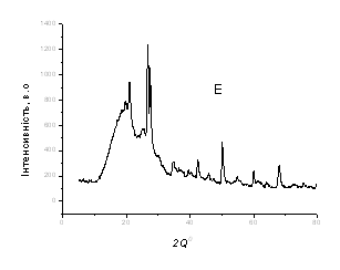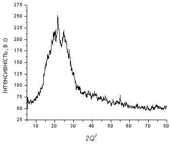 Рисунок 4.1.2 - Дифрактограма зразка ПАн-2 Починаючи із зразка ПАн/Гл-3 (рис.4.1.3, в-з) можна зробити висновок про те, що практично всі зразки містять деяку кількість кристалічної фази, і те що смуги які характерні для оксидів, що є в складі Гл, простежуються у синтезованих ПАн/Гл композитах, що засвідчує наявність неорганічних частинок у структурі синтезованого композита. Що в свою чергу проявляється на фізико-хімічних властивостях, а саме підтверджується на дериватограмах синтезованих зразків. На дифрактограмах зразків ПАн-1(а) - ПАн/Гл-10(ж) (див. рис. 4.1.3 ) в межах 2q = 10¸40о простежується відмінність у їхній структурі. Наявність характерних двох піків при 2q = 20,8о та 25,4о засвідчує, що зразки ПАн є легованими H2SO4, тобто перебувають у виді емеральдинової солі. В цілому надмолекулярна структура зразків ПАн характеризується співіснуванням аморфних та кристалічних ділянок. Видно, що аморфна фаза перевищує кристалічну фазу в одержаних нами зразках ПАн за виключенням зразка ПАн/Гл-9 (див. рис. 4.1.3, ж). Для цього зразка характерна вища кристалічність, що підтверджується появою піків при 2q = 8,3о, 15,5о та 30о (див. рис. 4.1.3, ж) [30]. Температура проведення синтезу практично не вплинула на структуру зразків ПАн (рис. 4.1.3, а, б). Вплив температури простежується для зразків ПАн/Гл (рис. 4.1.3, г`, д), що проявляється у вищій кристалічності зразків. При проведенні синтезу ПАн в присутності у розчині суспензії Гл, в продукті синтезу наявна ця речовина про що засвідчують дифрактограми (див. рис. 4.1.3, в - з), а саме характерний гострий пік при 2q = 26,3-27,1о, що відповідає кристалічному стану компонента Гл. Проведення синтезу без перемішування може сприяти утворенню полімерних структур шляхом поступового росту макромолекул контрольованого дифузією мономера до ростучої макромолекули. Характер дифрактограм (рис. 4.1.3, є і ж) відмінний і може засвідчувати дещо вищий ступінь кристалічності зразка ПАн/Гл [30] синтезованого в присутності Гл при 275 К. Очевидно, хімічне окиснення Ан за наявності Гл в реакційному середовищі відбувається частково на поверхні частинок глауконіту. В процесі витримування суспензії Гл в розчині Ан відбувається адсорбція молекул мономеру на частинках дисперсної фази. Із рис. 4.1.3 можна зробити висновки про наявність частинок Гл в полімеризаті, тобто можна стверджувати про утворення композиту ПАн/Гл. Слід відзначити, що майже усі синтезовані зразки при 275 К, мають більшу відносну інтенсивність смуг а ніж ті, що були синтезовані при 293 К. Зразки ПАн/Гл-8 (є), ПАн/Гл-9 (ж) відзначаються дещо вищою кристалічністю, що може бути зумовлено більшим вмістом глауконіту.
