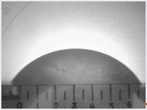 Дослідження процесу змочування зразків за допомогою вимірювання крайового (контактного) кута змочування може дати відповідь як про природу утвореного полімеру, так і про енергію зв’язування полімеру з поверхнею субстрату [39]. Дослідження явища змочування поверхні таблетованих зразків показує, що частинки Гл є покриті поліаніліном. На рис. 5 зображено світлину профілю краплини води на зразку ПАн/Гл-9. Водна крапля достатньо добре взаємодіє із поверхнею зразків ПАн та ПАн/Гл.