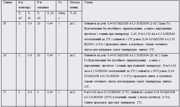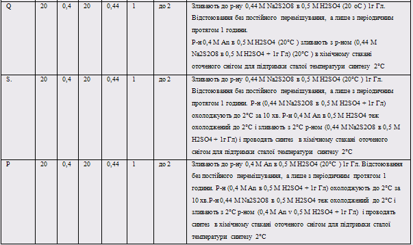 Рисунок 3.2.1.2 - Схематична ілюстрація синтезу ПАн/Гл композитів на міжчастинковому рівні. Зразки ПАн та композиту ПАн/Гл одержували хімічним окисненням аніліну Nа2S2O8 у водних 0,5 М розчинах H2SO4 при температурі 275 чи 293 К. Співвідношення Ан:Nа2S2O8 становило 1:1,1. До 50 мл розчину ПАн в 0,5 М H2SO4 вносили наважку Гл і перемішували суміш протягом однієї години при 293 К. 50 мл розчину Nа2S2O8 в 0,5 М H2SO4 вводили шляхом швидкого його вливання до розчину мономеру чи суміші Ан–Гл. Об’єм реакційної суміші 100 мл. Тривалість синтезу - одна година. Перемішування здійснювали механічною мішалкою. Після чого реакційну суміш витримували 24 години, фільтрували, промивали дистильованою водою до нейтрального значення рН та сушили у вакуумі при 60 оС. Схематичне зображення перебігу хімічного синтезу ПАн зображено на рис. 3.2.1.1 та рис. 3.2.1.2. Синтез ПАн та ПАн/Гл проводили при 273 і 293 К як з перемішуванням, так і без. Вихідні умови синтезів наведено в табл. 3.2.1.1 Таблиця - 3.2.1.1 Співвідношення компонентів в процесі синтезу