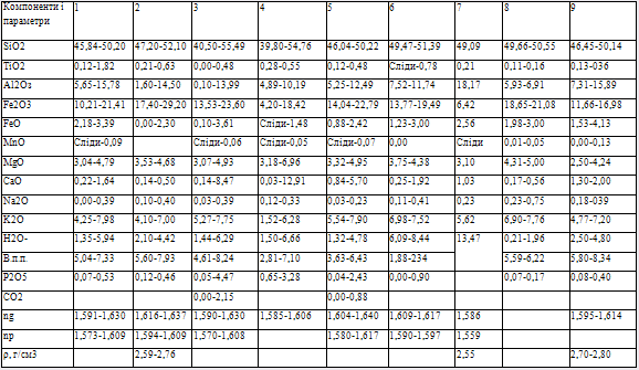 Примітка: 1 - з відкладів кембрію, ордовику, альб-сеноману та палеогену Волині; 2 — з відкладів чохла УЩ; 3 - зернистий глауконіт з відкладів крейди, палеогену й неогену Поділля; 4 — тонкодисперсний глауконіт з крейдових відкладів Поділля; 5 — з відкладів сеноману—маастрихту і палеогену Донбасу, 6 - з порід менілітової серії Передкарпатгя; 7 - сколіт з ямненських пісковиків; 8 - з олігоценових та верхньоміоценовнх (сарматських) відкладів Східного ПриЧорномор'я (HJM. Баранова, 1961); 9 — з альбських відкладів Кримського півострова перевідкладених фосфоритів середній показник заломлення становить 1,584−1,588, для голубувато-зеленого - 1,628-1,631, для жовто-зеленого з верхньобаденських пісків - 1,576, трав'янисто-зеленого - 1,588-1,594, ясно-зеле- ного з альбських відкладів Криму − 1,595, темно-зеленого - 1,607-1,610. Трав'яно-зелений з жовтуватим відтінком глауконіт з пісковиків нижньоменілі- тової світи має такі показники заломлення: n`g = 1,609; n`p = 1,590, а темно- зелений —дещо вищі: n`g = 1,617; n`p = 1,597 [51]. Твердість глауконіту Н становить 221,48-323,40 МПа. На кривих нагрівання глауконіту звичайно фіксують три ендотермічні ефекти, пов'язані, відповідно, з видаленням міжпакетної (адсорбційної) води в межах 50-180 °С, гідроксильних груп (констатуційної води) за 440−650 °С та з руйнуванням кристалічної ґратки мінералу (880-980 °С). Екзотермічний ефект за 250-300 °С зумовлений виділенням органічної речовини, а за 430-510 °С - з окисненням заліза, яке міститься у взірцях у вигляді сульфідів заліза − піриту, марказиту, мельниковіту. ІЧ-спектри поглинання глауконіту в ділянці деформаційних коливань Si-О наявні три смуги з максимумом за 440, 480, 550 та 440, 470, 500 см-1, відповідно. Чітко фіксують плече Si-O валентних коливань за 1000-1050 та 1000-1020 см-1. У ділянці валентних коливань ОН-груп простежують інтенсивну смугу з максимумом 3500-3520 см-1. На підставі вивчення поглинальної здатності різновікового глауконіту в ньому визначено обмінний комплекс катіонів, мг-екв/100г речовини: К+ (0,15- 2,24), Na+ (0,035-0,189), Са2+ (2,26-7,87), (0,58-3,47). Для деяких канонів виявлено залежність між їхнім вмістом i віком мінералу. Зокрема, чим давніший глауконіт, тим виший у ньому вміст обмінних К+, Na+, Mg2+. Катіонний обмін відбувається на поверхні частинок глауконіту, а порівняно висока поглинальна здатність мінералу зумовлена великим зарядом частинок, що, відповідно, пов'язане з дефектністю структури мінералу [51]. Новітні дослідження сорбційних властивостей глауконіту засвідчили, що він є вибірковим іонообмінним поглиначем довгоживучих радіоактивних ізотопів 137Cs та 90Sr, завдяки чому його можна використовувати для дезактивації стічних вод з підвищеною радіоактивністю. За високого показника сорбції 137Cs для глауконіту характерна незначна десорбція [51]. Глауконіт - мінерал, який вирізняється цілим комплексом унікальних властивостей. Природна суміш кремнезем-глауконіт при вмісті Гл до 15-20 % пропонується для використання в сільському господарстві як: кормова добавка, що підвищує масу і швидкість росту тварин; мінеральне добриво; а так само як сорбент нафтопродуктів, радіонуклідів і важких металів. 2. Обґрунтування вибору дослідження Пошук нових допоміжних речовин для посилення чи зміни властивостей поліаніліну та розширення сфери його використання є надзвичайно актуальною проблемою науки про електропровідні органічні полімери. Широкий спектр речовин неорганічно