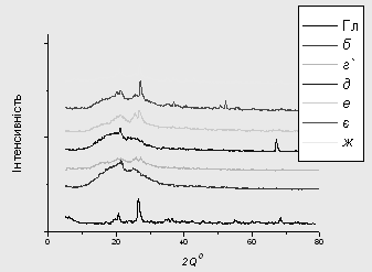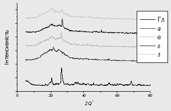 Рисунок 4.7.1 – Дифрактограми зразків синтезованих у видозмінених умовах синтезу зразка ПАн/Гл-9: а- синтез A; б - синтез B; в - синтез C; г -синтез D; ґ - синтез E. На рис. 4.7.1 зображені вибрані дифрактограми деяких із синтезованих композитів, що відповідають умовам близьким до умов синтезу композиту ПАн/Гл-9. Умови синтезу подані в табл. 4.7.1. Таблиця – 4.7.1 Умови синтезу зразків композитів видозміненого ПАн/Гл-9