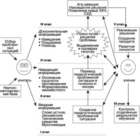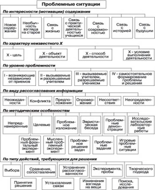 2. Проблемные ситуации возникают при столкновении учащихся с необходимостью использовать ранее усвоенные знания в новых практических условиях. Как правило, учителя организуют эти условия не только для того, чтобы учащиеся сумели применить свои знания на практике, но и столкнуть с фактом их недостаточности. Осознание этого факта учащимися возбуждает познавательный интерес и стимулирует поиск новых знаний. 3. Проблемная ситуация легко возникает в том случае, если имеется противоречие между теоретически возможным путем решения задачи и практической неосуществимостью избранного способа. 4. Проблемная ситуация возникает тогда, когда имеется противоречие между практически достигнутым результатом выполнения учебного задания и отсутствием у учащихся знаний для его теоретического обоснования [8, с.19]. Исходя из описанной типологии проблемных ситуаций, М.И. Махмутов намечает десять способов их создания: 1. Побуждение учащихся к теоретическому объяснению явлений, фактов, внешнего несоответствия между ними. Это вызывает поисковую деятельность учеников и приводит к активному усвоению новых знаний. 2. Использование учебных и жизненных ситуаций, возникающих при выполнении учащимися практических заданий в школе, дома или на производстве, в ходе наблюдений за природой. Проблемные ситуации в этом случае возникают при попытке учащихся самостоятельно достигнуть поставленной перед ними практической цели. Обычно ученики в итоге анализа сами формулируют проблему. 3. Постановка учебных практических заданий на объяснение явления или поиск путей его практического применения. Примером может служить любая исследовательская работа учащихся на учебно - опытном участке, в мастерской, лаборатории и т.д. 4. Побуждение учащихся к анализу фактов и явлений действительности, порождающему противоречия между житейскими представлениями и научными понятиями об этих фактах. 5. Выдвижение предположений (гипотез), формулировка выводов и их опытная проверка. 6. Побуждение учащихся к сравнению, сопоставлению и противопоставлению фактов, явлений, правил, действий, в результате которых возникает проблемная ситуация. 7. Побуждение учащихся к предварительному обобщению новых фактов. В этом случае возникает проблемная ситуация, так как сравнение выявляет свойства новых фактов, необъяснимые их признаки. 8. Ознакомление учащихся с фактами, носящими как будто бы необъяснимый характер и приведшими в истории науки к постановке научной проблемы. Обычно эти факты и явления как бы противоречат сложившимся у учеников представлениям и понятиям, что объясняется неполнотой, недостаточностью их прежних знаний. 9. Организация межпредметных связей. 10. Варьированные задачи, переформулировка вопроса. Дидактическая ценность этой классификации обусловлена тем, что она помогает учителю избрать конкретные пути создания проблемных ситуаций [8,с.20]. Методические приемы создания проблемных ситуаций: - учитель подводит школьников к противоречию и предлагает им самим найти способ его разрешения; - сталкивает противоречия практической деятельности; - излагает различные точки зрения на один и тот же вопрос; - предлагает классу рассмотреть явление с различных позиций ( например, командира, юриста, финансиста, педагога); - побуждает обучаемых делать сравнения, обобщения, выводы из 