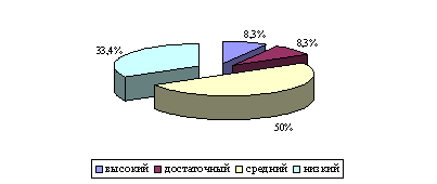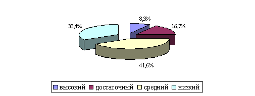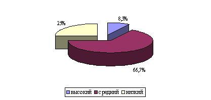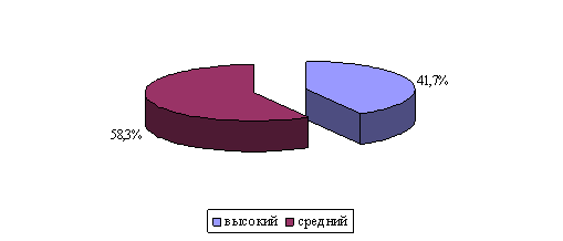 Рис. 2.9 Процентное соотношение результатов проверки начитанности учащихся экспериментальной группы. Как видно из рисунков 2.8 и 2.9, 75% учащихся контрольной группы имеют средний уровень сформированности читательской деятельности, 25% - низкий уровень. В экспериментальной группе эти показатели значительно выше. Низкий уровень у учащихся экспериментальной группы не зафиксирован. Средний уровень наблюдается у 58,3% детей, 41,7% имеют высокий уровень сформированности читательской самостоятельности. Таким образом, проведенное нами экспериментальное исследование позволяет сделать вывод о том, что специально подобранные методы по формированию читательской самостоятельности первоклассников на уроках внеклассного чтения способствуют росту уровня читательской самостоятельности детей, развивают их интерес к чтению, позволяют детям значительно лучше адаптироваться в учебном процессе и знакомить их с миром книг. Апробируя пути повышения уровня развития читательской самостоятельности учеников, мы не имели целью отказ от существующей в настоящее время организационно-методической системы учебы школьников - читателей. Решение проблемы мы видели прежде всего в оптимизации учебно-воспитательного процесса на уроках внеклассного чтения. Это требовало осознанного выбора таких методов учебы, которые при данных условиях обеспечивали бы максимально возможную эффективность развития читательской самостоятельности при рациональных затратах времени. Выводы к главе II 1. В ходе экспериментального исследования с целью выяснения состояния развития читательской самостоятельности первоклассников были проведены наблюдения за деятельностью школьников на уроках внеклассного чтения, наиболее оптимальными методами будут выступать: беседа, чтение (самостоятельное) вслух, обмен мнением о прочитанном, чтение-рассматривание, умение работать с книгой. В ходе работы с учащимися проводились беседы, а также осуществлен констатирующий эксперимент, направленный на выявление уровня сформированности читательской самостоятельности первоклассников. Анализируя результаты констатирующего эксперимента нами было выявлено четыре уровня по которым можно судить о сформированности у учащихся первого класса читательской самостоятельности. В контрольной группе с высоким уровнем 8,3%,средний 66,7%, а с низким 25%. В экспериментальной группе с высоким 50%, средний 25%, низкий 25%. Анализ результатов констатирующего эксперимента позволил сделать вывод о том, что уровень развития читательской самостоятельности младших школьников не отвечает требованиям. В итоге смогли самостоятельно применить такие самые распространенные приемы, как пользование содержанием в конце книги, 8,3% учеников; нахождение книги по внешним и внутренним признакам -16,7% .составление плана прочитанного-16,7%, оформление карточки на прочитанную книгу-8,3% школьников. Таким образом, определение уровня сформированности читательской самостоятельности первоклассников в ходе констатирующего эксперимента позволила сделать вывод о необходимости внедрения методов, направленных на формирование читательской самостоятельности первоклассников на уроках внеклассного чтения. 2. В ходе формирующего эксперимента для решения задачи обеспечения полноценного восприятия произведения, понимания учащимися 