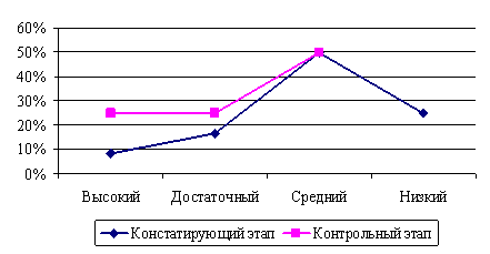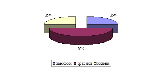 Рис. 2.6 Процентное соотношение результатов проверки навыков чтения у учащихся экспериментальной группы. Как видно из рисунков 2.5 и 2.6, результаты проверки учащихся контрольной группы остались практически без изменений, в то время как в экспериментальной группе скорость чтения значительно возросла. Так, у 25% учащихся наблюдается высокий уровень навыка чтения, у такого же количества детей – уровень выше среднего. Средний уровень отмечен у 50% первоклассников экспериментальной группы, низкого уровня не зафиксировано. На рисунке 7 показана динамика изменения скорости чтения у учащихся экспериментальной группы.