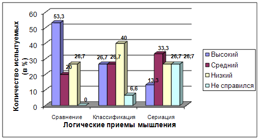 Диаграмма 4. Распределение испытуемых по группам в зависимости от уровня сформированности логического приема мышления «сериация» до и после обучающих воздействий (в %) В результате проведенной работы количество детей с высоким уровнем сформированности логического приема «сериация» увеличилось в 4 раза – с 13,3 % до 53,3 %. На контрольном этапе исследования у этих детей устойчиво проявлялось умение самостоятельно вычленять признак сериационного ряда (числовой лесенки), владеть алгоритмом действия упорядочивания. При этом они рассуждали, аргументировали свои действия. При увеличении количества детей с высоким уровнем уменьшилось и количество детей со средним и низким уровнем сформированности логического приема сериации – с 33,3 до 26,7 % и с 26,7 до 20 % соответственно. Стоит особо отметить, что, если на начальном этапе исследования 26,7 % детей (4 ребенка) не справились с заданием сериации, то на контрольном этапе таких детей не выявлено. Итак, сравнительный количественный и качественный анализ результатов исследований констатирующего и контрольного характера свидетельствует об эффективности проведенной работы по развитию логических приемов мышления старших дошкольников посредством организации комплекса игр. В этом мы видим подтверждение гипотезы исследования, что развитие логических приемов мышления сравнения, классификации и сериации у детей старшего дошкольного возраста при формировании их счетной деятельности будет характеризоваться динамикой при целенаправленной и систематической организации комплекса игр. Заключение Мышление в отличие от других процессов совершается в соответствии с определенной логикой. Приемы логического мышления – сравнение, обобщение, классификация и сериация позволяют систематизировать знания ребенка, развивать его умственные способности. Анализ научной литературы позволил изучить особенности проявления и развития мышления старших дошкольников, которыми являются следующие: - старший дошкольник может подходить к решению логической ситуации тремя способами: используя наглядно-действенное мышление, наглядно-образное и логическое. - с учётом развития к этому возрасту поисковой и планирующей деятельности, умение анализировать и использовать получаемую в ходе решения задач информацию, появлению произвольности в поведении и познавательных процессах умственный потенциал старшего дошкольника оказывается достаточно высоким; - мышление ребёнка связано с его знаниями. В современных образовательных технологиях знания не рассматриваются в качестве основной ценности и могут варьироваться в широких пределах. Центр тяжести переносится с того, какой фактический материал дается детям, на то, как он дается. Это возможно при условии, что педагог не дает готовых знаний, образцов и определений, а стимулирует каждого ребенка на их поиск, развивает познавательную инициативу путем создания различных проблемных ситуаций, организации поисковой деятельности, постановки простейших опытов, формирует умение спрашивать, наблюдать. В связи с этим образовательный процесс должен быть построен таким образом, чтобы помочь ребёнку овладеть высоким уровнем логики, т.е. приёмами мыслительной деятельности, позволяющими самостоятельно добывать необходимую информацию, понимать её, применять на практике; - ст