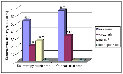 Диаграмма 2. Распределение испытуемых по группам в зависимости от уровня сформированности логического приема мышления «сравнение» до и после обучающих воздействий (в %) Диаграмма 2 позволяет провести сравнительный количественный анализ результатов исследования до и после обучающих воздействий. Материал диаграммы наглядно показывает, что в результате проведенной работы количество детей с высоким уровнем сформированности логического приема мышления «сравнение» увеличилось (с 53,3 до 66,7 %). Эти дети показали устойчивое умение сравнивать 2 множества, устанавливая равенство и неравенство посредством счета, выражая в речевых формулировках: «равно», «больше», «меньше»; владение 2 способами уравнивания групп предметов: добавлением одного предмета к меньшему их числу или удалением одного предмета из большего их числа. При выполнении задания действовали активно и самостоятельно, рассуждая, объясняя свои действия. Увеличилось также количество детей со средним уровнем сформированности логического приема сравнения - с 20 до 33,3 %. Эти дети умеют сравнивать 2 множества, устанавливая равенство и неравенство посредством счета, выражая в речи результат сравнения: «равно», «больше», «меньше». Затруднялись в применении способов уравнивания групп предметов: выбирали один лишь способ - либо добавлением одного предмета к меньшему их числу или удалением одного предмета из большего их числа. Поэтому второй способ применяли с некоторой помощью взрослого. Но стоит отметить, что при этом дети действовали не молча, как это было на начальном этапе, а стремились рассуждать, объяснять свои действия. Особенно радует, что на контрольном этапе исследования не выявлено детей с низким уровнем сформированности логического приема сравнения. Обратимся к результатам исследования логического приема «классификация».