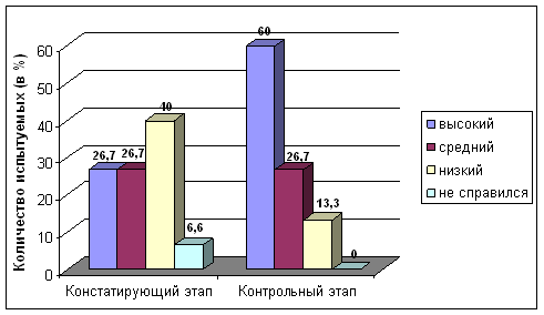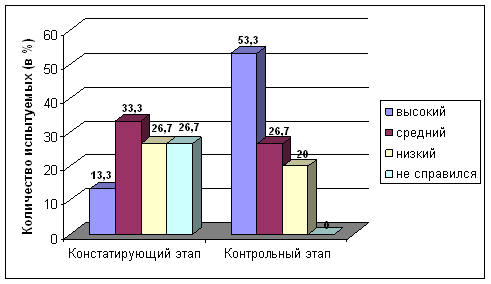 Диаграмма 3. Распределение испытуемых по группам в зависимости от уровня сформированности логического приема мышления «классификация» до и после обучающих воздействий (в %) дошкольник логический мышление счетный Как видно из диаграммы 3, количество детей с высоким уровнем сформированности логического приема классификации увеличилось более чем в два раза – с 26,7 % до 60 %. Эти дети самостоятельно осуществляли классификацию по всем 3 свойствам, обнаруживали логические связи (взаимосвязь обобщающего слова и правильность классификации) и отражали их в речи. Выполняли задание самостоятельно, активно, рассуждая и мотивируя свои действия. Заметно уменьшилось количество детей с низким уровнем сформированности классификации – с 40 % (6 детей) до 13,3 % (2 ребенка). Эти дети только с помощью взрослого осуществляют классификацию. При выполнении задания воспитатель побуждал детей объяснять свои действия, в речи формулировать основание для классификации. Не выявлено на контрольном этапе исследования ни одного ребенка, который бы не справился с заданием, а таких на начало работы было 4 ребенка (26,7%). Материал диаграммы 4 показывает динамику развития логического приема «сериация» до и после организации комплекса игр.