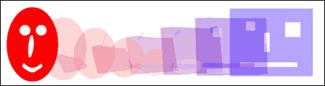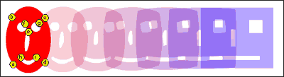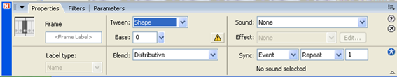 Рис.4- Easing: +100 Параметр Blend, определяет алгоритм перехода: Distributive (распределяющий, общий) и Angular (угловатый). Первый старается максимально смягчить, сгладить переход от одной фигуры к другой. Второй же пытается сохранить пропорции углов. Если переход вас не удовлетворяет, можно поэкспериментировать с этим параметром. И, наконец, последний инструмент в анимации shape tweening - контрольные точки (shape hints, дословно - подсказки для форм). Это точки, с помощью которых вы помогаете Flash правильно осуществить переход. Без них не обойтись в случае сложных форм. Пользоваться ими очень легко: На первом ключевом кадре (с которого начинается анимация) вы добавляете контрольную точку (Modify->Transform->Add shape hint, Ctrl+Shift+H). На сцене появится маленькая красная точка, обозначенная буквой латинского алфавита. Вы прикрепляете ее к той части изображения, которая двигается не так, как вы хотели. Затем вы переходите на второй ключевой кадр, и прикрепляете эту же точку к части, в которую должна была перейти часть на начальном кадре. Точка будет уже зеленого цвета, а на начальном кадре она станет желтой. Так вы можете отличать начальные и конечные ключевые точки, так как на одном кадре могут присутствовать и те и другие. Удалить все точки можно с помощью Modify->Transform->Remove All Hints. Удалить же единственную точку можно, нажав на ней правую кнопку мыши, и в контекстном меню выбрав Remove Hint. Так как контрольные точки обозначаются буквами латинского алфавита, то их может быть максимум 27. На рисунках (Рис.5 и Рис.6) вы можете заметить разницу между кадрами, созданными без использования контрольных точек, и с использованием таковых.