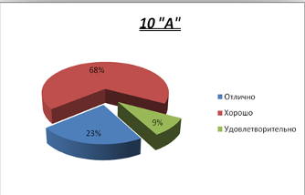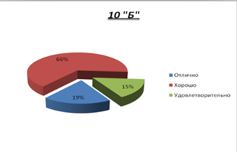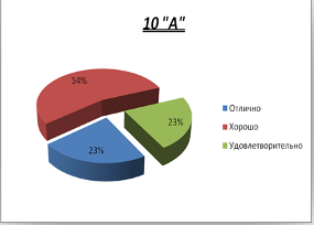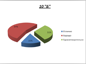 Как видно на диаграмме в 10 «Б» всего лишь 15 % класса имеют по предмету оценку «отлично» и 31 % оценку «удовлетворительно». Учитывая хорошую успеваемость учащихся 10 классов по другим предметам данного профиля, мы сделали вывод, что невысокое усвоение предмета «информатика» обусловлено низкой мотивацией учащихся. В связи с этим в процесс обучения был внедрен разработанный в рамках данной дипломной работы элективный курс по информатике, ориентированный на профильное обучение в 10 классе. Результаты статистической оценки упеваимости учащихся после проведенной работы представлены ниже.