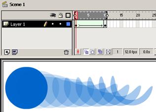 Рис. 2 В этой маленькой анимации круг переходит в некое подобие полумесяца. На первом ключевом кадре я нарисовал круг, а на втором ключевом кадре (это 10-й кадр сцены) превратил его в полумесяц. Немного о параметрах shape tweening. Вы, наверное, заметили, что появилась пара других параметров, когда вы выбрали shape tweening в панели Frame - Easing и Blend (см. Рис. 1). Поле Label содержит метку кадра. Easing задает обратное экспоненциальное ускорение. Величина этого параметра может изменяться от - 100 до + 100. Это означает, что если вы зададите отрицательный easing, движение будет происходить с положительным ускорением, скорость будет увеличиваться (см. Рис. 3). И наоборот, если easing будет положительным, анимация будет замедляться (см Рис. 4).