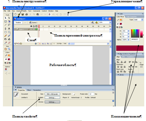 Курс имеет свою специфику: • Интенсивный характер межпредметных связей информатики с астрономией, широкое использование понятийного аппарата, методов и средств, присущих данной отрасли научного знания; • Значение изучения информатики и астрономии для формирования ключевых компетенций выпускника современной школы, приобретения образовательных достижений, которые востребованы на рынке труда; • Исключительная роль изучения информатики и астрономии в формировании современной научной картины мира; • Интегрирующая роль информатики и астрономии в содержании общего образования человека. В результате освоения курса учащиеся должны: Знать/понимать: · преимущества и недостатки растровой и векторной графики; · основные технологии создания, редактирования, оформления, сохранения, передачи информационных объектов различного типа с помощью современных программных средств векторного редактора Macromedia Flash; Уметь: · иллюстрировать учебные работы с использованием средств редактора Macromedia Flash; Использовать приобретенные знания и умения в практической деятельности и повседневной жизни для: · эффективного применения информационных образовательных ресурсов в учебной деятельности, в том числе самообразовании; · ориентации в информационном пространстве, работы с распространенными автоматизированными информационными системами; · автоматизации коммуникационной деятельности; · соблюдения этических и правовых норм при работе с информацией; · эффективной организации индивидуального информационного пространства. Элективный курс опирается на учебник по Macromedia Flash, что позволяет учащимся проявлять большую самостоятельность при выполнении практических работ. Курс подготавливает старшеклассников к успешному обучению по профилю. Программа носит примерный характер. Каждый учитель при выборе данного курса должен ориентироваться на удовлетворение именно тех задач, которые перед собой ставит тот учащийся, входящий в группу, с которой предстоит учителю работать. Курс ориентирован на удовлетворение запросов конкретных групп учащихся, это значит, что программы предполагают определенную доработку, которую учитель может осуществить, исходя из своих профессиональных возможностей и особенностей состава учащихся. В программе курса поставлены следующие цели: 1. дать понимание принципов построения и хранения изображения; 2. научить учащихся создавать анимационные картинки; 3. научить применять полученные навыки работы в Macromedia Flash в других учебных дисциплинах и в повседневной жизни. 2.2 Содержание элективного курса «Моделирование в среде Macromedia Flash» Блок I. В этом блоке походит изучение основ Macromedia Flash и отрабатываются навыки рисования. Рассказать учащимся о растровой, векторной графике и о мультимедийных программах, работающих с каждым из видов. Знакомство с интерфейсом Macromedia Flash. Разобрать раздел панели рисования (инструменты рисования и их свойства), градиентное заполнение, преобразование заливки, работа с текстом.[см. Приложение 1] Задачи: 1. Научить основам программы; 2.Научить работать с графикой и текстом в рамках данной программы. Уметь: работать с интерфейсом программы; работать с объектами, преобразовывать их; пользоваться всеми инструментами. Знать: назначение панелей программы; как работать с графикой; как создавать рисунки и 