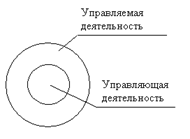 Рис. 2 «Оргуправленческое отношение» Оргуправленческое отношение предполагает управляемый объект, управляющий объект, и определенное отношение между ними: управляющая система как бы «захватывает» управляемый объект, он становится ее частью (рис.2). Речь идет о рефлексивном охвате, который становится возможным за счет специальной мыслительной работы. Управляемая система находится как бы внутри управляющей. Из этого следует, что управлять может только тот, кто имеет определенные знания об управляемом объекте.