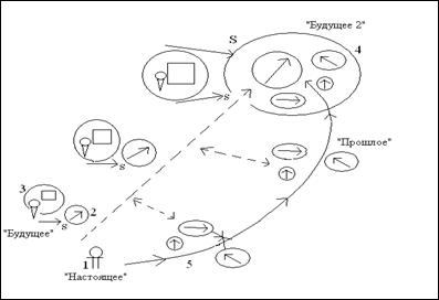 1 - «Преобразователь» 2 - создаваемое общественное образование 3 - формирующаяся мыслящая инстанция 4 - организация нового общественного порядка 5 - существующий общественный порядок и траектория «естественного» движения S, s – схемы организации нового общественного порядка и нового общественного образования Рис. 5 «Встреча в будущем» Особенностью управления социальными изменениями является то, что будущее представляется специфическим образом, как «место встречи в будущем» «преобразователя» с обществом, которое, проделав определенный путь, пришло к необходимости общественных изменений. Будущее представлено не в виде определенного проекта общественных отношений и не в виде закономерного развития процессов, а как форма соорганизации нескольких разнородных движений (рис. 5). Преобразователь разворачивает новые формы организации общественной жизни, прежде всего на себе. Причем эти формы организации претерпевают изменения как в результате взаимодействия с существующими общественными образованиями, так и в результате разворачивания самого преобразователя до общественного образования, соразмерного по мощности существующим. Действия по сближению траекторий движения преобразователя и инерционного движения общества состоят в выделении проблемных ситуаций в обществе и демонстрации их решения на основе новых походов, которые развивает преобразователь. Таким образом создается серия прецедентов – демонстрация возможностей новых способов мышления и деятельности. На их основе должны создаваться образцы – технологические описание способов действий и методов решения проблем. Наличие образцов позволяет расширять зону освоения новыми формами организации общественной жизни. По мере того как преобразователь и то общественное образование которое он формирует становятся все активнее и мощнее, общество тоже начинает реагировать. В какой-то момент различные общественные единицы начинают самоопределяться по отношению к новообразованию. Возникают сначала рефлексивные а потом и действительные игры. На этом этапе начинается высвобождение ранее организованного общественного ресурса и его перераспределение, кроме этого еще рождаются и новые, старыми правилами не регулируемые и никем не контролируемые, ресурсы. Овладение этим ресурсом как правило и является решающим фактором Проблема дальнейшего разворачивания изменений состоит в том, что к моменту плотного контакта с обществом Новообразование должно быть соразмерно и конкурентоспособно по отношению к обществу в целом. Это означает, что существующие структуры не могут его ни ассимилировать, ни уничтожить, ни игнорировать. Возникающие пределы экспансии и роста новообразования создают в обществе ситуацию относительного равновесия и переходу к формированию новых общественных отношений. Этот процесс участия в становлении нового общественного порядка и есть и является «местом встречи». Закрепление результата осуществляется приданием общественному порядку историко-культурного смысла [14]. С. В. Попов выделяет ряд принципов, регулирующих помышление и осуществление общественных изменений [15]. 1. Принцип «встречи в будущем». Образ будущего представляется в виде «траекторий» движения в историческом процессе становления и новой организации, в которой будет участвоват