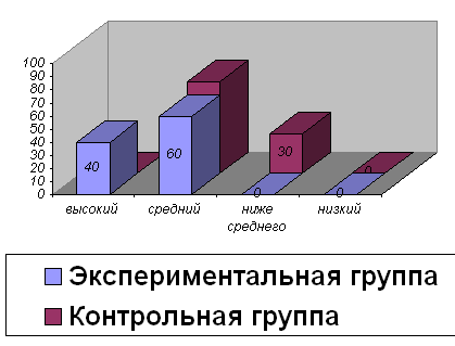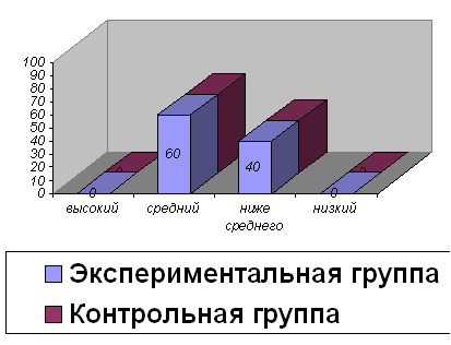 Анализ диаграммы позволяет сделать вывод о том, что на начало исследования уровень развития коммуникативных способностей как в экспериментальной так и в контрольной группах одинаковы. После формирующего эксперимента контрольные исследования уровня развития коммуникативных способностей следующее: в экспериментальной группе результаты повысились – на высоком уровне – 2 детей (40%), на среднем уровне – 3 (60%). В контрольной группе явных изменений не наблюдается – 4 детей на среднем уровне (70%), один на уровне ниже среднего (30%). Диаграмма 2 Диагностика уровня развития коммуникативных способностей у заикающихся детей 8-9 лет (после формирующего воздействия)