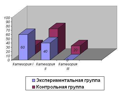 Анализ диаграммы показывает, что в обеих группах – и контрольной, и экспериментальной – дети имеют одинаковые проблемы в общении. После формирующего воздействия показатели изменились и выглядят следующим образом: - в экспериментальной группе 3 детей смогли справиться и устранить основные «помехи» общения – категория I – 60%; у двоих детей наблюдаются некоторые проблемы в общении, но в менее выраженной степени – категория II – 40%; - в контрольной группе выраженных изменений не наблюдается: один ребенок относится к категории I (20%), трое – к категории II (60%), один ребенок – категория III (20%). Выразим это в диаграмме 4. Диаграмма 4 Диагностика «помех» в общении детей с заиканием 8-9 лет (после формирующего воздействия)