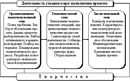 Из этой таблицы видно, что проектная деятельность является интегративным видом деятельности, синтезирующим в себе элементы игровой, познавательной, ценностно-ориентационной, преобразовательной, профессионально-трудовой, коммуникативной, учебной, теоретической и практической деятельности. Проведенный анализ позволяет нам определить творческую проектную деятельность школьников как интегративный вид деятельности по созданию изделий и услуг, обладающих объективной или субъективной новизной и имеющих личную или общественную значимость. Психологическая динамическая структура творческой проектной деятельности (как и любого другого вида деятельности) включает в себя мотив, цель, способ, предмет, результат. Мотивом называется то, что побуждает личность к деятельности, ради чего она осуществляется. В качестве мотива обычно выступает конкретная потребность, которая удовлетворяется с помощью данной деятельности. Можно выделить следующие мотивы творческой проектной деятельности: n познавательные: удовлетворение потребности в знаниях, умениях, навыках; n материальные: удовлетворение потребности в продуктах питания, одежде, предметах быта и т.п.; n социально-профессиональные: удовлетворение потребности в социально-профессиональном самоопределении, карьере; n художественно-эстетические: удовлетворение потребности в красоте; n духовные: удовлетворение потребности в самопознании, самореализации и самосовершенствовании. Творческая проектная деятельность полимотивирована, т.е. побуждается несколькими мотивами. Но определенные из них являются доминирующими. В качестве цели деятельности выступает ее продукт. Продуктами творческой проектной деятельности школьников являются изделия или услуги, обладающие объективной или субъективной новизной и имеющих личную или общественную значимость, то есть способных решить определенную (личную) или общественную проблему (повысить качество обучения, укрепить здоровье людей, украсить быт человека и т.д.). Способ деятельности - это совокупность действий, операций, методов и приемов преобразования предметов этой деятельности. В творческой проектной деятельности используются разнообразные методы: вербальные и невербальные, мыслительные, орудийные, графические, механические, химические, биологические, энергетические, информационные и др. В качестве средств осуществления проектной деятельности используются различные инструменты, приспособления, машины, автоматические устройства и др. Предметом деятельности называется то, с чем она имеет дело, на что она направлена. Это могут быть вещества, материалы, информация, энергия, живые существа, люди. Результатами творческой проектной деятельности могут быть швейные изделия, модели, украшения, мебель, технологическое оборудование, дидактические материалы, произведения искусства и др. Необходимо различать разницу между структурой поисково-конструкторской и проектной деятельностью. Специалисты, изучающие проблемы технического творчества (Д.М. Комский, Ю.С. Столяров), выделяют семь этапов поисково-конструкторской деятельности школьников при создании нового технического объекта: формирование технической задачи, формирование технической идеи, разработка модели (схемы) конструирования, моделирование и эксперимент, создание опытного 