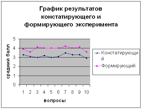 Анализ формируемой части экспериментальной работы показал, что качество знаний и умений достигло 3,9 балла (средний балл), что свидетельствует об уровне качества усвоения учащимися содержания материала. В начале экспериментальной работы по результатам констатирующего эксперимента качество знаний было несколько ниже, а именно 3,2 балла. Результаты, полученные нами экспериментально по данным тестирования в процессе констатирующего и формирующего эксперимента представим в виде графика: