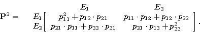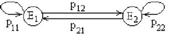 Рис. 10 По этому графу находим распределение по состояниям в момент t= 2: P(E1)= (0,6*(0,2)2+ 0,6*0,3*0,5+0,6*0,5*0,6)+(0,1*0,5*0,2+0,1*0,2*0,5 +0,1*0,3*0,6) +(0,3*0,6*0,2+(0,3)2*0,6)+(0,3*0,1*0,5)=0,437; P(E2)= (0,1*(0,2)2+0,1*0,5*0,3+0,1*0,3*0,1)+0,6*0,3*0,2+0,6*0,2*0,3 +0,6*0,5*0,1)+(0,3*0,1* 0,2+(0,3)2*0,1+0,3*0,6*0,3)=0,193; P(E3)= 0,37. Пример 12. Доказать, что P(n)= Pn для двух состояний цепи Маркова. Решение. Пусть цепь Маркова с двумя состояниями E1 и E2 задана своей матрицей перехода P: