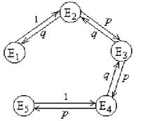 И, наконец, для полноты изложения введем еще одно понятие: назовем состояние цепи Маркова эргодическим, если оно одновременно возвратно и непериодично. Если любое состояние цепи Маркова является эргодическим, то назовем ее эргодической цепью. Пример 8. Частица, находящаяся на прямой, движется по этой прямой под влиянием случайных толчков, происходящих в моменты t1, t2, t3, ...Частица может находиться в точках с целочисленными координатами 1, 2, 3, 4, 5; в точках 1 и 5 находятся отражающие стенки. Каждый толчок перемещает частицу вправо с вероятностью и влево с вероятностью q, если частицы не находятся у стенки. Если же частица находится у стенки, то любой толчок переводит ее на единицу внутрь промежутка [1,5]. Найти матрицу перехода P и ей соответствующий граф. Решение. Пусть Ei=(t) ,i = 1, 2, 3, 4, 5. Тогда граф перехода выглядит следующим образом: