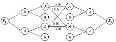 Рассмотрим, какое потомство и с какой вероятностью может быть у особей разного пола, если они выбираются из E2. Пусть Bi= {i-й потомок}, i= 1, 2 и B1,B2 - разного пола, тогда варианты потомков и их вероятности можно найти по следующему графу: