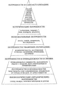Пирамида человеческих ценностей (по А. Маслоу). Признается, что человек изначально активен, источники его имманентной активности – мотивации находятся в нем самом, в его психологии, признается существенная роль сознания для детерминации поведения человека, социальные потребности, жизненные цели, когнитивные факторы. Мотивация – это система факторов, определяющих поведение человека. Любая форма поведения может быть объяснена как внутренними (потребности, мотивы, желания, цели, намерения, интересы), так и внешними (стимулы) причинами – диспозиционной и ситуационной мотивациями. Практически любое действие человека следует рассматривать как двоякодетерминированное: диспозиционно и ситуационно. Мотивация мыслится как процесс выбора между различными возможными действиями, процесс, регулирующий, направляющий действие на достижение специфических для данного мотива целевых состояний и поддерживающий эту направленность. Мотивация объясняет целенаправленность действия. В одинаковых ситуациях разные люди ведут себя неодинаково. Вместе с тем, в зависимости от состояния, один и тот же человек может по-разному воспринимать определенную ситуацию, действовать в ней различно. Реально наблюдаемое поведение является результатом циклического процесса непрерывного воздействия и преобразования, в котором субъект действия и ситуация взаимно влияют друг на друга (30). Потребность в самореализации, по А. Маслоу, наивысшая. Считается, что к ее удовлетворению человек приступает, удовлетворив низшие потребности, однако такое представление слишком упрощено. В жизни именно неудовлетворение низших потребностей зачастую толкает человека к самореализации: Петрарку на путь самореализации толкнуло неудовлетворенное половое влечение, А. Эйнштейна – непризнание среди коллег, О. Генри – долговая тюрьма, Седьмая симфония Д. Шостаковича написана в блокадном Ленинграде, а неудовлетворенные потребности безопасности и свободы толкали к творчеству М. Булгакова и других представителей литературы эпохи социализма. По сути дела, самореализация в творчестве есть попытка возместить или заместить отсутствие материального иллюзорными эквивалентами: эмоциональными переживаниями физическое обладание, теоретическими построениями отсутствие конкретного знания предмета, громким звуком заглушить голод и страх. Это либо попытка построить гармонию внутри себя, когда гармония внешнего мира нарушена, либо действие, направленное на слияние с гармонией окружающего мира. Именно столпники, принявшие схиму, отшельники, то есть люди, не отягощенные ничем материальным оказываются наиболее духовными и способными к самоактуализации, правда, их опыт зачастую невосстребован, потому что не понят, или находится в противоречии с принципами организации общества, и их творчество до поры до времени можно рассматривать как социальный артефакт, опровергающий расхожее мнение о том, что развитие индивида вне общества и без деятельности невозможно, на мой взгляд, невозможно оно лишь на этапе становления личности, когда личность сформирована, ей поводыри не нужны. Наверное, правильно ставить вопрос о просоциальном и асоциальном творчестве, хотя и такая постановка будет лишь условностью из-за субъективности. Известны примеры и иного рода, когда, казалось бы, полнейшее 