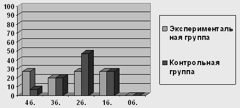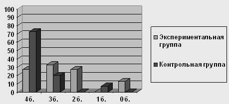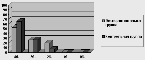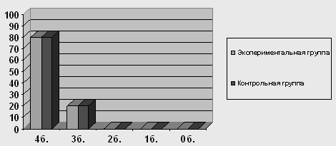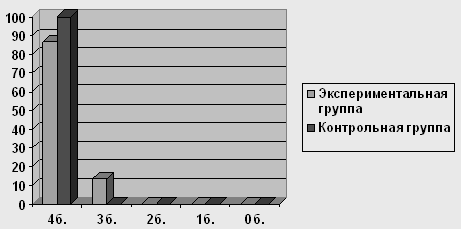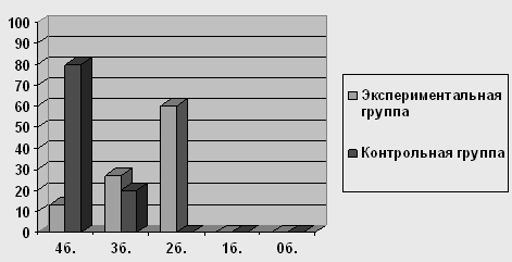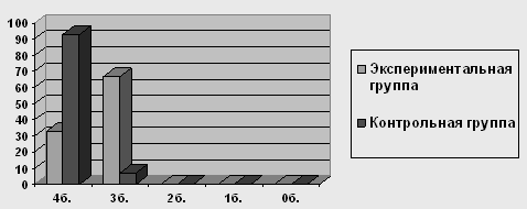 Рисунок 2 Результаты выполнения детьми экспериментальной и контрольной групп заданий на исследование объема и качества активного словаря 3.3 Особенности распознавания общих категориальных значений Эта группа заданий представлена в виде 2 процедур. Задание №1. Из заданий, вошедших в эту группу, более сложными для детей экспериментальной группы оказалось называние следующих общих категориальных значений: "времена года" - только 4 из 15 назвали правильно, среди них 2 ребенка с доминирующим русским, 1 ребенок с доминирующим черкесским и 1 ребенок, одинаково владеющий тремя языками: русским, черкесским, абазинским; "мебель" - справились 6 детей, 4 из которых – с доминирующим русским; "инструменты" - справились только 3 из 15 обследуемых, в числе которых 1 ребенок с доминирующим русским языком, 1 ребенок с доминированием черкесского языка и 1 ребенок полилингв, свободно владеющий тремя языками. Следует отметить, что многие дети приводили обобщающие слова на доминирующем (черкесском) языке, причем это явление можно диагностировать как смешение языков, т.к. на просьбу назвать то же слово по-русски, дети отвечали, что они и так называют по-русски. Процесс идентификации при усвоении второго языка у детей-билингвов происходит стихийно-направленно, т. е. устанавливаются прямые соответствия между языковыми единицами родного и второго языков в условиях непосредственных языковых контактов. Но поскольку обозначения определенных понятий в родном и втором языках обычно не совпадают, а ребенок усвоил данные обозначения только на доминирующем языке, то в подобной ситуации ребёнок в языковом акте часто не замечает, что пользуется понятиями только одного из языков, отождествляя их со вторым не доминирующим языком. Детям оказывается сложно понять, что они говорят не на требуемом языке. Результаты исследования показали, что лишь 2 ребенка - полилингв, свободно владеющий тремя языками и билингв с доминированием русского языка (13% из 100%) справились с заданием без ошибок, набрав высший балл; еще 4 детей с доминирующим русским допустили по 1-2 ошибки и набрали по 3 балла. Остальные 9 детей (60% из 100) набрали лишь 2 балла за задание, допустив по 3 ошибки. Дети, вошедшие в контрольную группу, справились с заданиями значительно лучше. Лишь 3 ребенка из 15 (20% из 100%) допустили единичные ошибки в определении общих категориальных значений и набрали 3 балла. Остальные 12 детей (80%) набрали высший балл – 4.