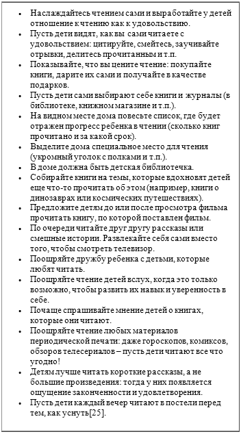 Акция "Поделись книгой". Смысл этого приёма заключается в том, что дети приносят прочитанные ими книги дома и должны представить эти книги так, чтобы другим захотелось их прочесть. Помимо повышения интереса к книге , улучшается техника чтения, дети учатся навыкам общения[24]. Потребность в чтении не возникает сама по себе и не складывается в результате принудительного общения с книгой. Насилие здесь недопустимо. Любовь к чтению закладывается годами, и первостепенное значение при этом имеет отношение к чтению самих родителей. Любят ли в семье читать? Есть ли в доме своя библиотека? Часто ли ребенок видит родителей с книгой? Делятся ли они с детьми своими впечатлениями о прочитанном? Следят ли родители за книжными новинками, в том числе и в области детской литературы? Как правило, читать любят дети читающих родителей. Если родители всерьез обеспокоены недостаточно заинтересованным отношением ребенка к чтению, им могут пригодиться советы американского психолога В.Уильямса. Вот некоторые из них. Эти советы могут помочь и учителям начальной школы. Дети, которые не любят читать, нередко плохо владеют техникой чтения. Именно отсутствие хорошо отработанного навыка чтения может служить препятствием для свободного общения ребенка с книгой. В этом случае следует уделить особое внимание отработке технической стороны чтения, которая, как и любой другой навык, требует специальных усилий и времени для закрепления умения и его совершенствования. Времени, отведенного для этого на уроках чтения, очевидно недостаточно. Для закрепления навыка чтения ребенок нуждается в систематических, ежедневных домашних упражнениях. Эффективными являются пятиминутки чтения на каждом уроке, будь то урок математики или труда. Суть пятиминутного чтения заключается в том, что учащиеся в начале каждого урока читают книгу, приготовленную ими для такого чтения. Формирование навыка чтения тесно связано с общим речевым развитием ребенка, поэтому в случае явных затруднений следует обратиться за необходимыми рекомендациями к логопеду. Объяснять детям значение непонятных им слов, учить правильно произносить слова. Это важно и для понимания того, что ученик читает, и для темпа чтения, и для правильности чтения. Учителя и родители должны своим личным примером воспитывать в детях интерес к чтению. Учить их ориентироваться в книгах, анализировать прочитанное, владеть способами чтения, способами смысловой обработки текста, "использовать книжные богатства для формирования личности"[25]. Для улучшения навыков чтения особенное значение имеет эмоциональное состояние ребенка. Родителям, а также педагогам необходимо помнить, что ребенок, любимый ими независимо от своих недостатков, получающий эмоциональную поддержку взрослых, а значит, уверенный в себе, легче обучается, чему бы то ни было, в том числе и чтению. "Интерес к книгам, желание и умение их читать лишь тогда становится личным достоянием каждого ребёнка (вне зависимости от индивидуальных способностей и возможностей ), когда знания и умения, необходимые для осмысленного прочтения текста (т.е. техника чтения), формируются и совершенствуются в неразрывной связи с изучением ребёнком круга доступных книг, путём личной деятельности с книгами- в коллективе или индивидуально, в благоприятном для чтения окружении ребё