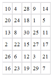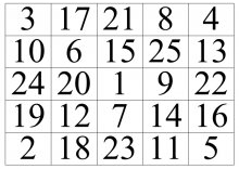 Учитель называет координаты, а дети отыскивают слово и наоборот. Опытный читатель обычно читает часть фразы, додумывая конец. Развитие антиципации значительно увеличит скорость чтения ваших учеников. Часто в учебнике "Русский язык" предлагается найти устойчивое словосочетание. Это задание можно использовать для отработки антиципации. Первую часть устойчивого выражения предлагается прочитать, а вторую, закрыв, предлагается добавить: Сделал дело - гуляй смело. Лучше поздно чем никогда. И т.д. Такое упражнение полезно и для развития речи. На антиципацию отдельных слов предлагаю выполнить упражнение в восстановлении возможных слов на основе входящих в их состав согласных. Например: Ц-Л – цель, целый; С-Л – сало, соль, сила, осёл. Интересное упражнение "Угадай" вводится с момента обучения чтению и усложняется с переходом к чтению связных текстов. Напишите на доске первый слог слова, например, до- и дайте задание отгадать какое слово спрятано (дорога, доля, домашний и т.д.). Также можно поступать и с текстом. Например: Мы с бра…(том) пош…(ли) в ки…(но).[3] Применяя на уроках упражнения надо помнить о том, что только систематическое их применение даст хорошие результаты. А чтение, как важное учебное умение, будет помогать детям добывать новые знания. Одним из недостатков чтения может явиться малое поле зрения.Раз угол зрения мал, то в поле зрения такого читалеля попадает меньше букв (частей строк), чем вообще возможно. И здесь изобретены приемы, помогающие расширить угол зрения: Использование таблицы Шульте. Таблицы Шульте (англ. Shultz tables) — случайно расположенные числа (или другие объекты) для тренировки быстрого их нахождения по порядку. Обычно применяются для исследования и развития психического темпа восприятия, в частности скорости зрительных ориентировочно-поисковых движений (что является основой скорочтения). Также позволяет расширить поле зрения. Широкое поле зрения сокращает время поиска информативных фрагментов текстов. Таблица Шульте представляет собой листок бумаги, на котором нарисован квадрат со сторонами 20-25 см. Квадрат разбивается на 25 ячеек, в которые вписываются в беспорядке числа от 1 до 25. Правила тренировки на таблицах Шульте. · Находить цифры необходимо беззвучным счётом, то есть про себя, в возрастающем порядке от 1 до 25 (без пропуска). Найденные цифры указываются только взглядом. В результате такой тренировки время считывания одной таблицы должно быть не более 25 сек. · Перед началом работы с таблицей взгляд фиксируется в ее центре, чтобы видеть таблицу целиком. · При поиске следующих друг за другом цифр разрешается фиксация глаз только в центре таблицы. Горизонтальные движения глаз запрещены. Расстояние от таблицы до глаз такое же, как и при чтении обычного текста, то есть примерно 25—30 см. · Время и периодичность тренировок нужно выбирать так, чтобы не переутомляться. При работе с таблицами Шульте следует постоянно помнить, что тренировка здесь не самоцель. Главное — расширение поля зрения, что может быть достигнуто только при аккуратном выполнении правил работы с таблицами, систематическими и осознанными тренировками.[34] Засеките время, ребенок начинает поиск цифр в таблице от 1 до 30, при этом показывая их. При частом применении этих таблиц время сокращается, счет можно вести в обратном порядке, т.е. от 30 до 1..